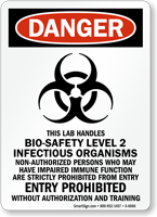Moving upwards, Biosafety Level 2 signs are suitable for laboratories that have handwashing sinks, eye washing stations in case of accidents, and doors that automatically close and lock.