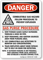 Use red danger for flammables and yellow caution for high pressure. Check our propane signs and nitrogen signs for specific headers.