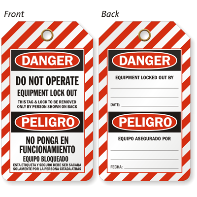 This Bilingual Danger OSHA Lockout 2-Sided Tag prevents workers and visitors from starting a machinery or equipment that should not be operated.