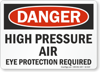 Near high-pressure air lines, you should post signs that warn of the risk of severe injury and state that the air valve must be shut off before any servicing. We also provide signs that mandate the use of eye protection, which is a critical piece of personal protective equipment (PPE) when working with pressurized systems.