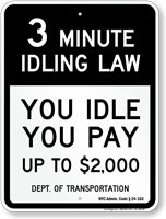 Most no idling ordinances allow 3–5 minutes of idling before a violation occurs, though exact limits vary by location. Some school and hospital zones reduce this to 1–2 minutes. In cold or hot weather, exceptions may allow longer idling for temperature control. Signs like the 3-minute idling law sign help communicate clear local regulations.