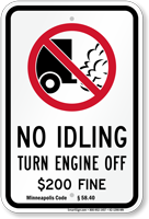 Fines for violating no idling restrictions typically range from $50–$500 depending on jurisdiction and vehicle type. Commercial vehicles often face higher fines. Signs such as the no idle zone turn your engine off sign are used to emphasize enforcement near schools and public areas. For legal standards, see MUTCD Section 2B.