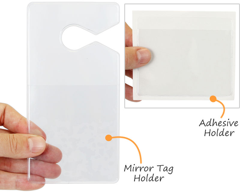 • • Choose between a vinyl holder that hangs from a rearview mirror or one that sticks on the inside the window.