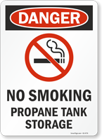 Our propane danger sign in red/black/white is used for immediately life-threatening hazards such as a propane storage room where ignition could cause an explosion, while our caution propane storage OSHA sign in yellow/black is appropriate for lower-risk propane situations.