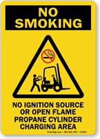A propane storage area typically requires no smoking signs, no open flame warnings, propane storage identification signs, and emergency shutoff location signs, and our danger propane storage area sign and full propane signs collection cover all of these in Danger and Caution headers in durable outdoor-rated aluminum and adhesive vinyl.