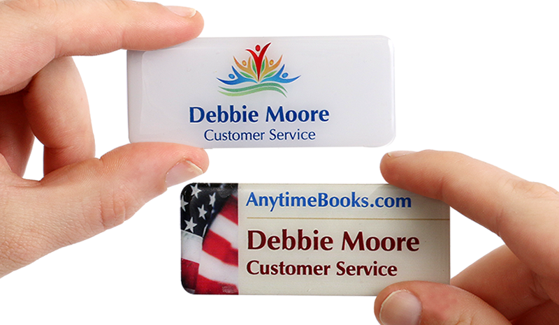 • Sturdy, 60 mil thick plastic layered with a 50 mil thick, glossy laminate. Your name and design pop-off the badge giving a prominent look.