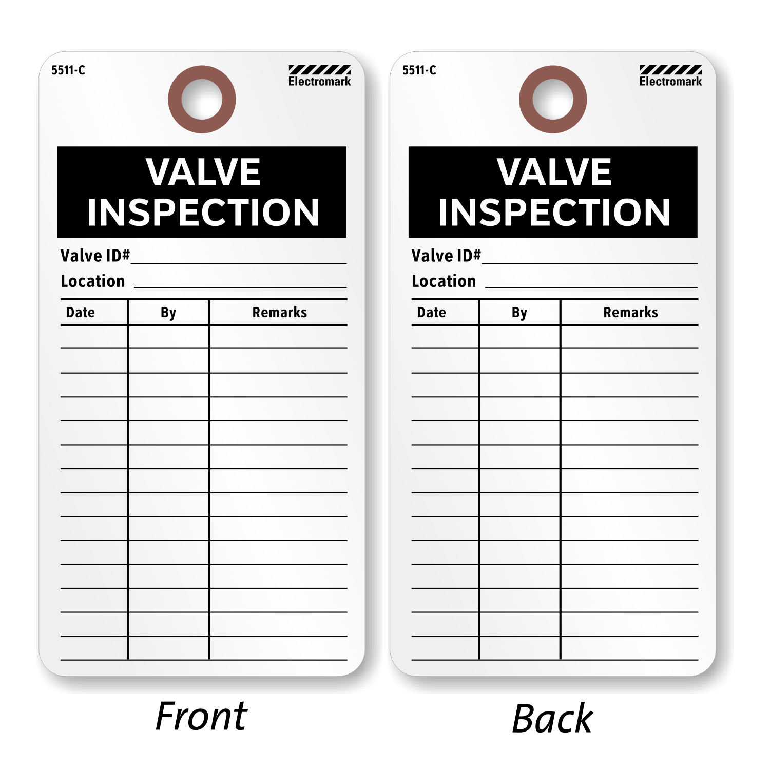 Each tag is equipped with a reinforced fiber patch around the eyelet for extra pull strength.
