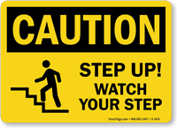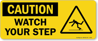 You should install "watch your step" signs at any location with an abrupt or unexpected change in elevation, especially those smaller than a full step. OSHA's regulations for walking-working surfaces require employers to protect against hazards, and this includes posting warnings for wet or slippery areas, uneven surfaces, and any elevation change (like a curb or single step) that could cause a trip.